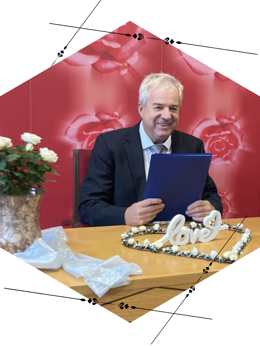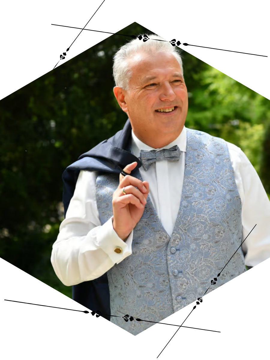 Durch seine häufigen Auftritte vor großen Gesellschaften weiß Gerry, wie man Worte findet, die berühren und in Erinnerung bleiben. Jede Freie Trauung gestaltet er individuell, wobei er die persönliche Geschichte des Paares einfühlsam in den Mittelpunkt stellt. Mit seiner warmherzigen und offenen Art schafft er unvergessliche Momente voller Emotionen.